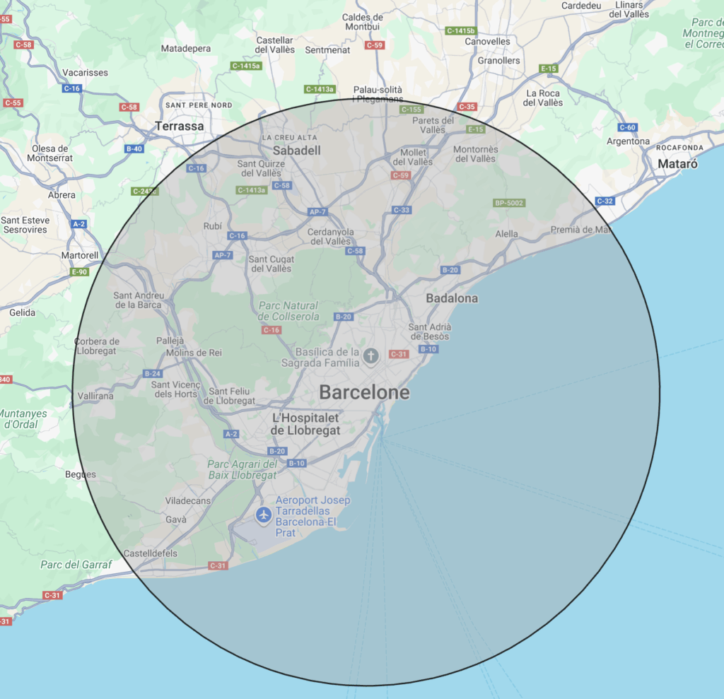 Cubrimos Barcelona y hasta 30km alrededor (L’hospitalet de Llobregat, Badalona, Sant Cugat, Castelldefels, Sabadell, Cornellà, …). Más allá aplicamos 0,50€/KM. Consulta la lista en la página Zonas y elige tu barrio : llegamos donde estés.